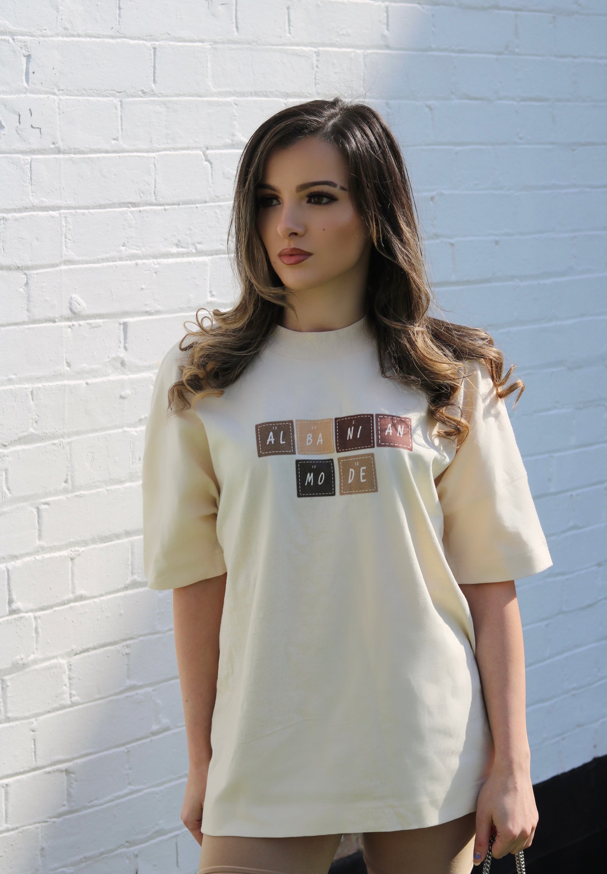 This oversized fit t-shirt is perfect for chill days and beyond. Featuring a nude material with an 'Albanian Mode' periodic table inspired slogan. Team with jeans/shorts, trainers and tote bag for a chill day look.